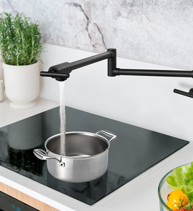 Bateria POT FILLER została wyposażona w aerator, który sprawia, że strumień wody jest miękki i napowietrzony.