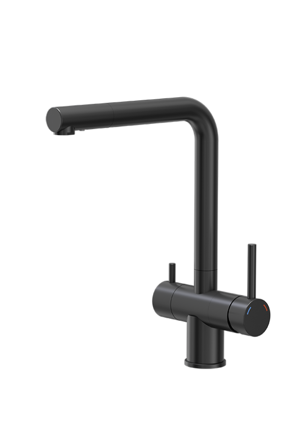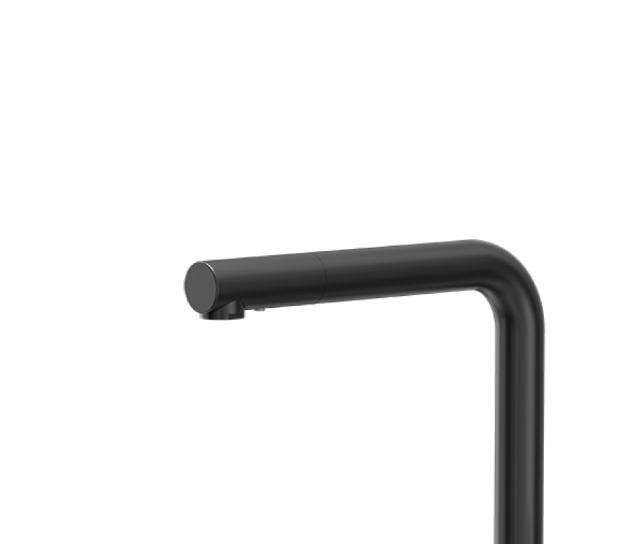 Czarny elastyczny wąż gumowy zapewnia optymalny zakres ruchu, umożliwiając swobodne manewrowanie bez ograniczeń. Ten innowacyjny design baterii ułatwia mycie naczyń czy zlewozmywaka oraz umożliwia napełnianie nawet największych garnków.