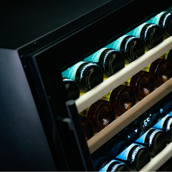 Trzywarstwowe szklane drzwi z filtrem UV w kolorze czarnym dodają winiarce elegancji, a jednocześnie umożliwiają podziwianie zawartości. Wysokość szklanego frontu sprawia, że winiarka świetnie komponuje się w zabudowie kuchennej.
