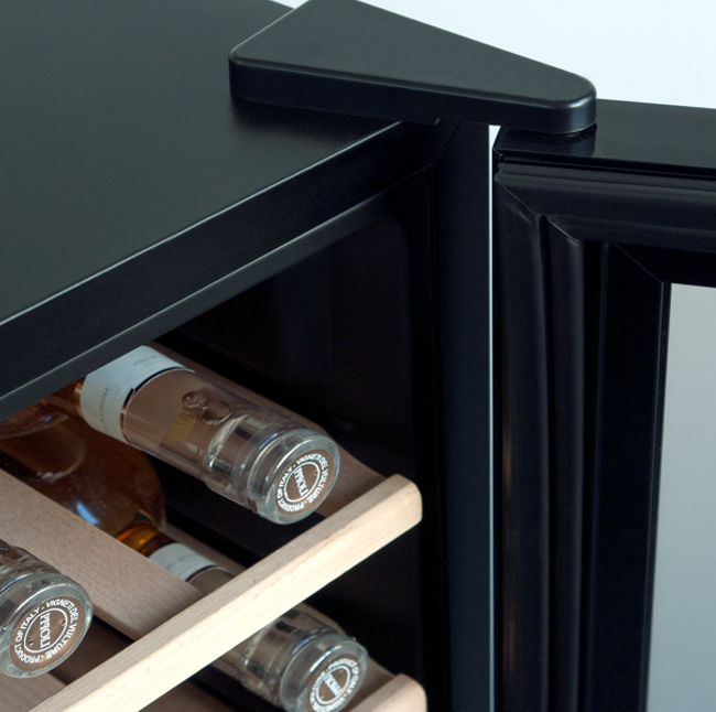 Dwuwarstwowe szklane drzwi z filtrem UV w kolorze czarnym dodają winiarce elegancji, a jednocześnie umożliwiają podziwianie zawartości, tworząc efektowną wizytówkę Twojej kolekcji, która zachwyci każdego gościa.