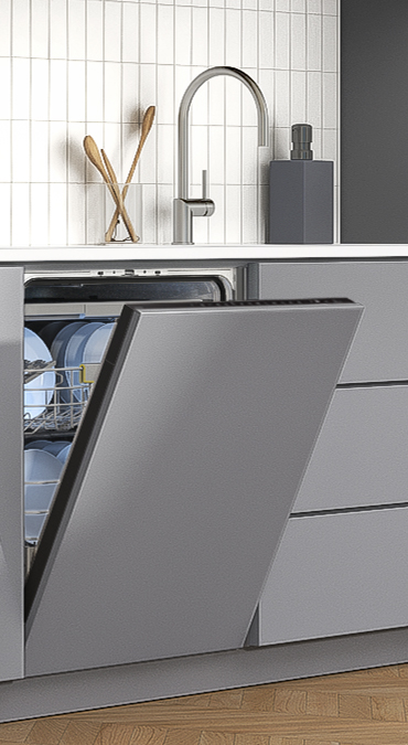 Upewnij się, że Twoja zmywarka idealnie pasuje do mebli kuchennych. Zawiasy ślizgowe Kitchen Fit™ umożliwiają przesuwanie frontu meblowego na drzwiach w górę po ich otwarciu. Dzięki temu, w przeciwieństwie do zawiasów stałych, drzwi można całkowicie otworzyć, bez konieczności nieestetycznego podcinania cokołu pod zmywarką³.