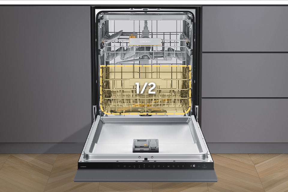 Ze zmywarką Samsung możesz myć tyle, ile akurat potrzebujesz, przy okazji oszczędzając na rachunkach za prąd i wodę. Urządzenie samo optymalizuje zużycie wody do niepełnego załadunku.
