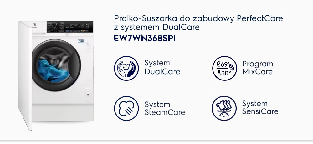 System DualCare automatycznie dostosowuje parametry cyklu do rodzaju tkanin i ciężaru ładunku. Dzięki temu rzeczy są prane i suszone w odpowiedniej temperaturze i przy optymalnych ruchach bębna. Pranie, a następnie suszenie w jednym wygodnym cyklu.