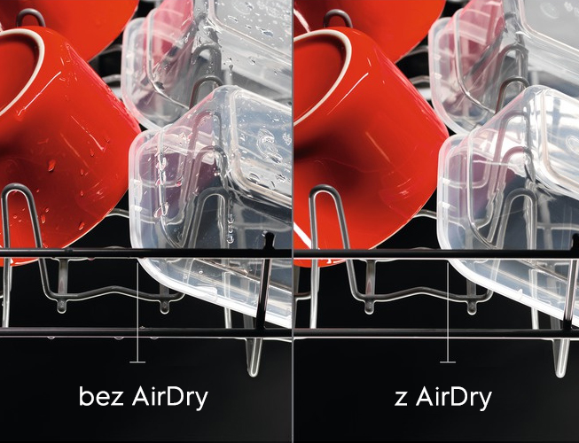 Wykorzystanie obiegu powietrza w zmywarkach AirDry pozwala uzyskać nawet 3x lepsze efekty suszenia. Zmywarka otwiera się tuż po zakończonym cyklu, pozwalając wyschnąć naczyniom w naturalny sposób. Bez ryzyka zniszczenia frontów mebli i blatu kuchennego.