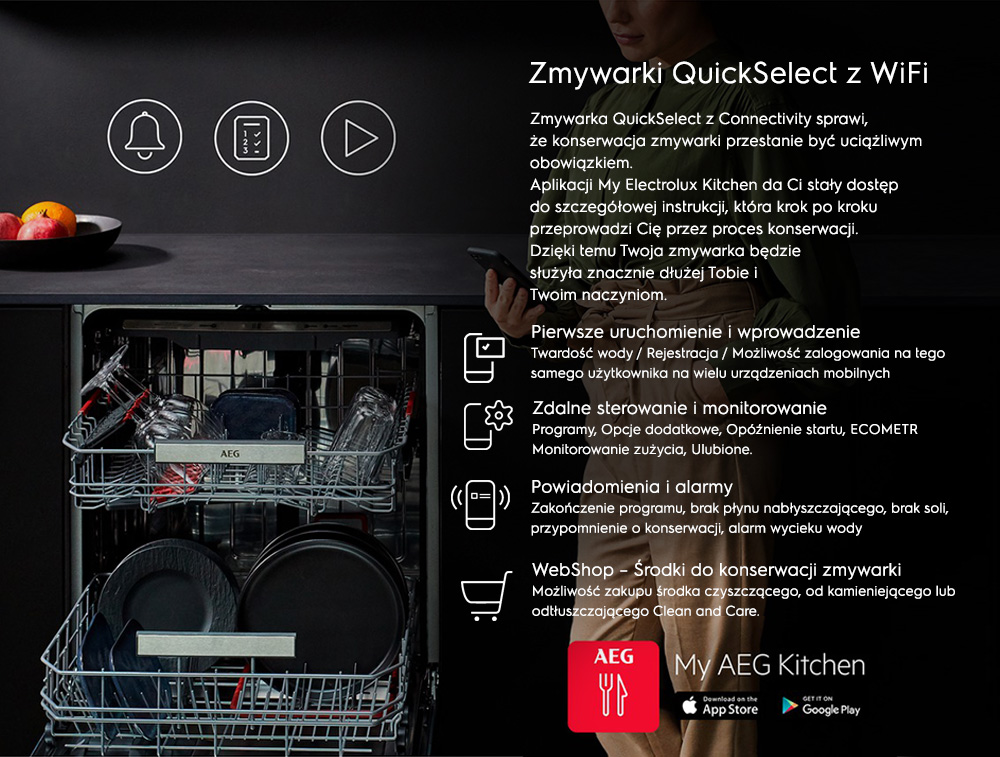 Używając programu MachineCare, usuniesz tłuszcz i kamień z wnętrza zmywarki, zapewniając jej tym samym efektywną pracę przez długi czas.