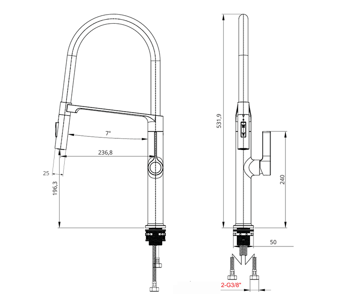 Czarny elastyczny wąż gumowy zapewnia optymalny zakres ruchu, umożliwiając swobodne manewrowanie bez ograniczeń. Ten innowacyjny design baterii ułatwia mycie naczyń czy zlewozmywaka oraz umożliwia napełnianie nawet największych garnków.