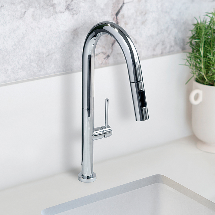 To nowoczesne urządzenie kuchenne z funkcjonalną, wyciąganą wylewką, oszczędzającym wodę systemem, ceramiczną głowicą oraz łatwym montażem w elegancki sposób dopełni każde wnętrze.