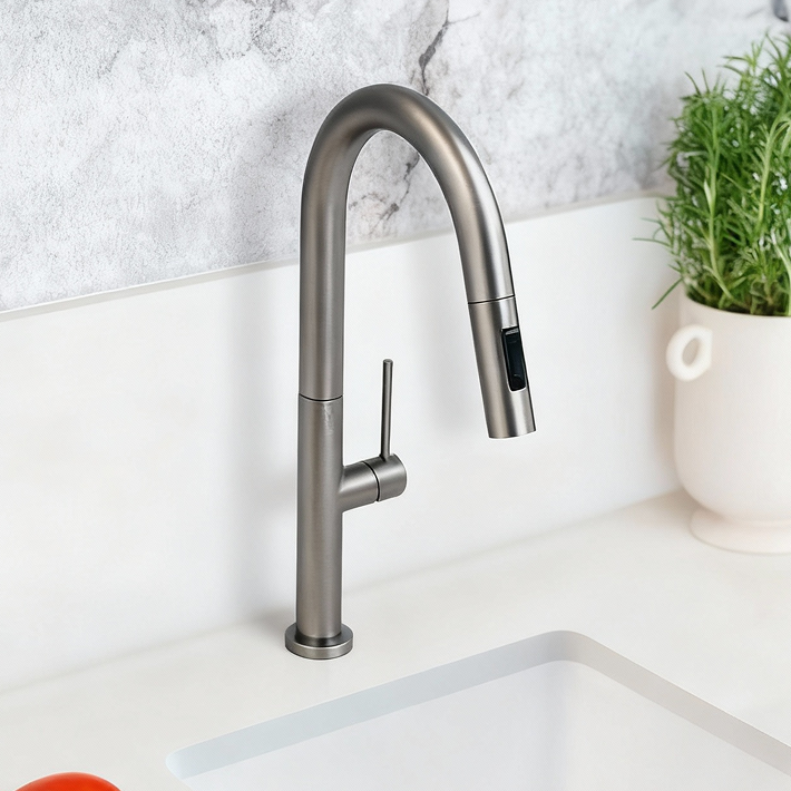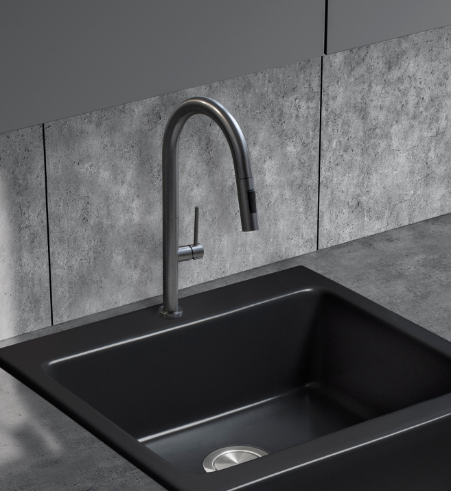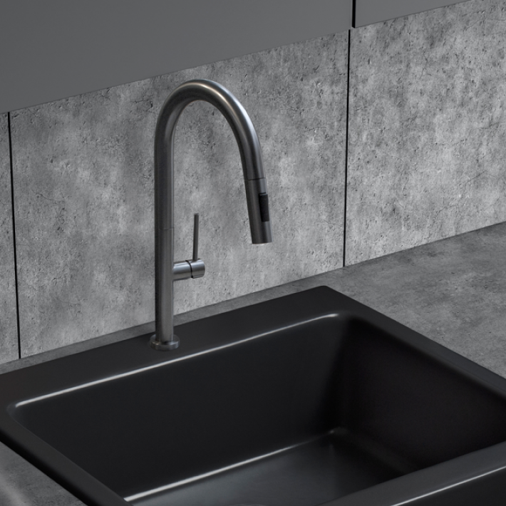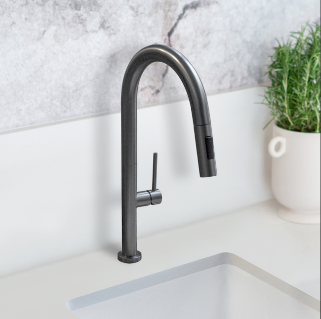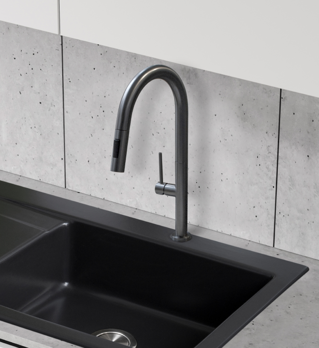Baterie kuchenne w kolorze gun metal prezentują się nowocześnie i elegancko, dodając wnętrzu surowego, industrialnego charakteru. Chromowane baterie emanują blaskiem i nowoczesnością, doskonale odbijając światło i czyniąc przestrzeń bardziej przestronną.