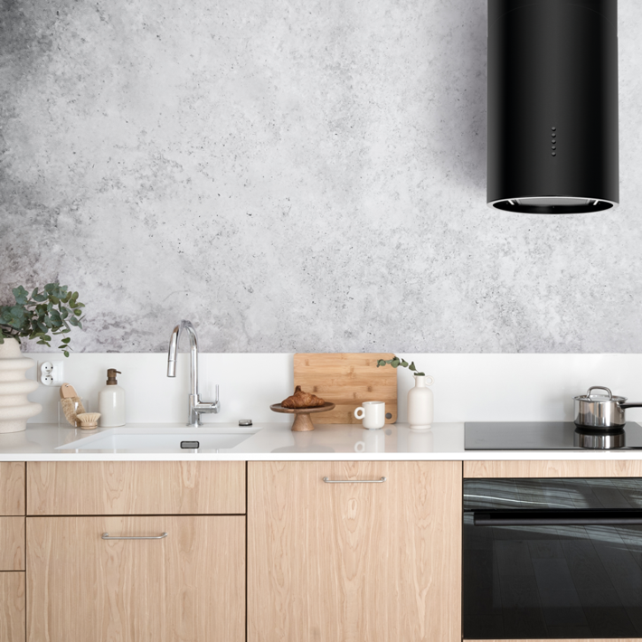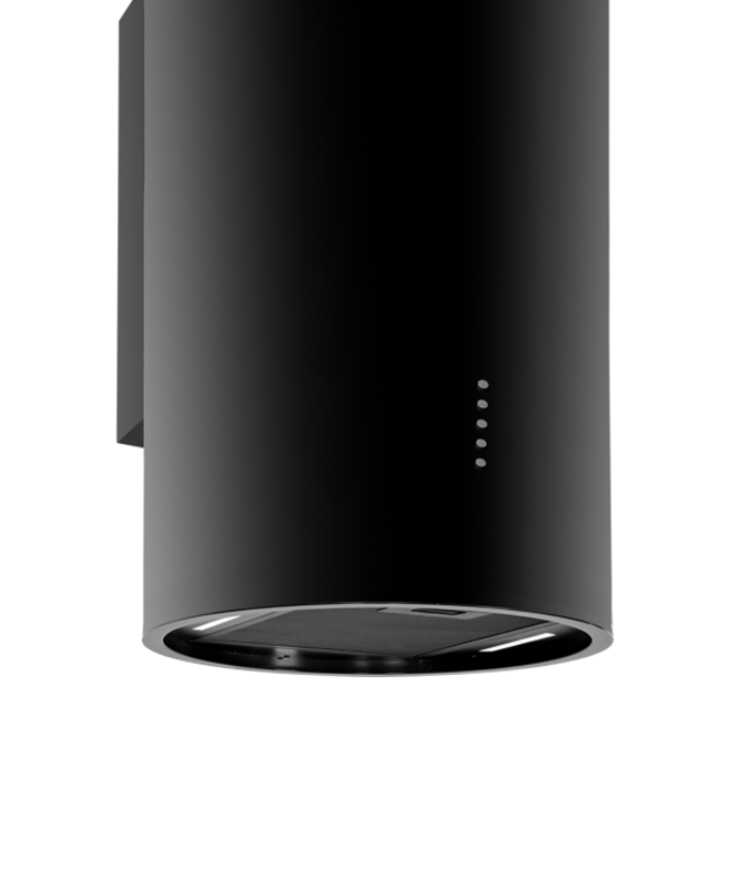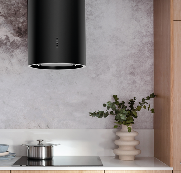 Elegancki i nowoczesny wygląd okapu, zdominowany przez głęboką czerń szklanego frontu i cylindryczny kształt idealnie komponuje się z każdym stylem kuchennym – od minimalistycznych wnętrz po industrialne aranżacje.