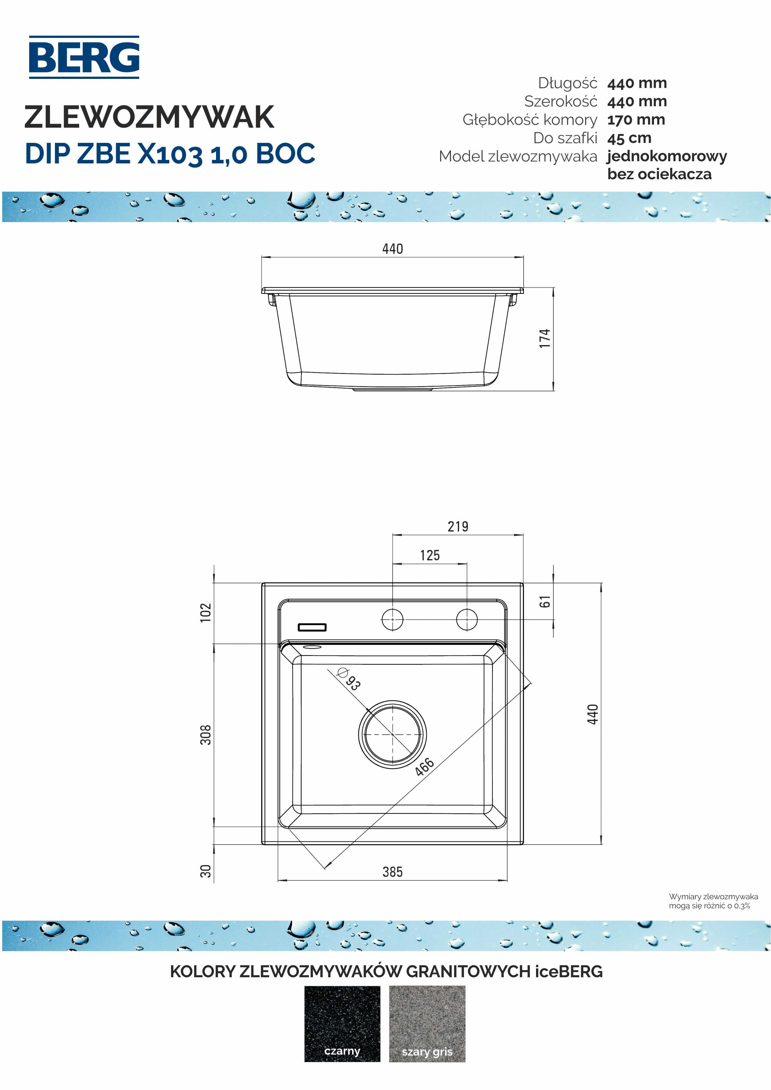 ZLEWOZMYWAK GRANITOWY ICEBERG DIP ZBE S103 GRIS SZARY 1,0 BOC