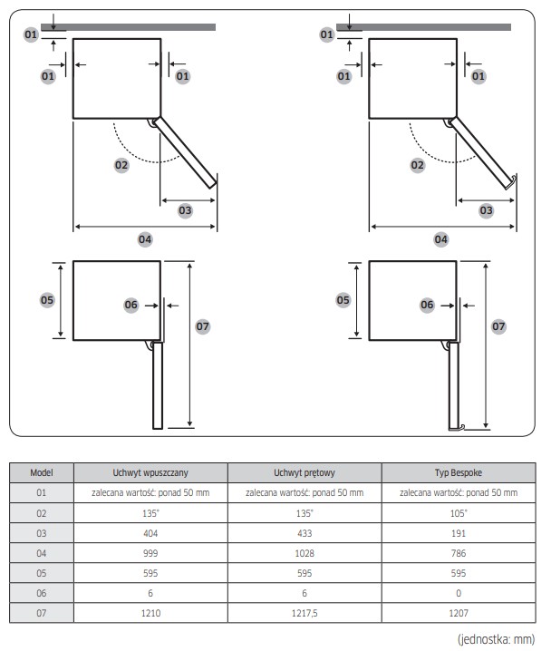 Głębokość bez uchwytu drzwi netto 658 mm
