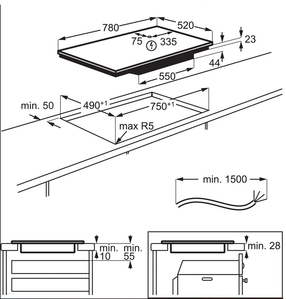 Strefa przednia, środkowa: indukcja, 1400/2500 W/145 mm