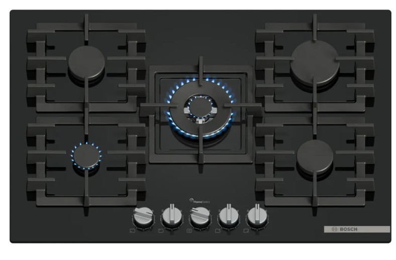 5 pojedyncze żeliwne ruszty. Szerokość płyty: 75 cm. Płyta obsługuje gazy: 2E